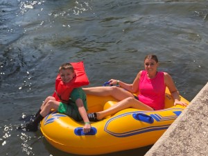 Tonianne and Talon floating the river in Lava. He had to ride the rapids with his feet hanging over the tube so he could be cool, but mostly to scare his mother.
