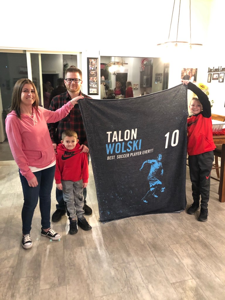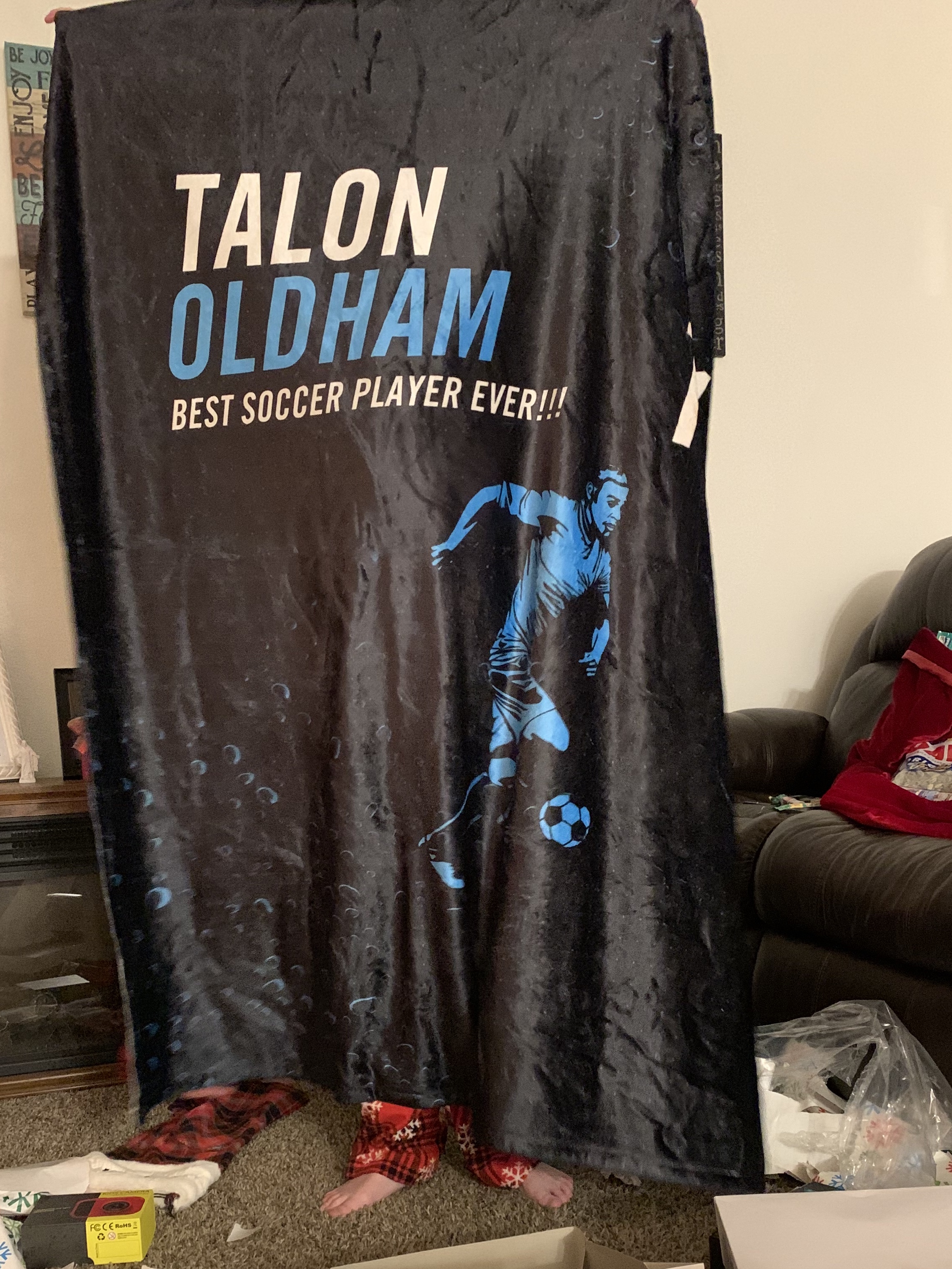 Here’s the new blanket Jon and Tonianne gave Talon for Christmas. Welcome to the Oldham’s
