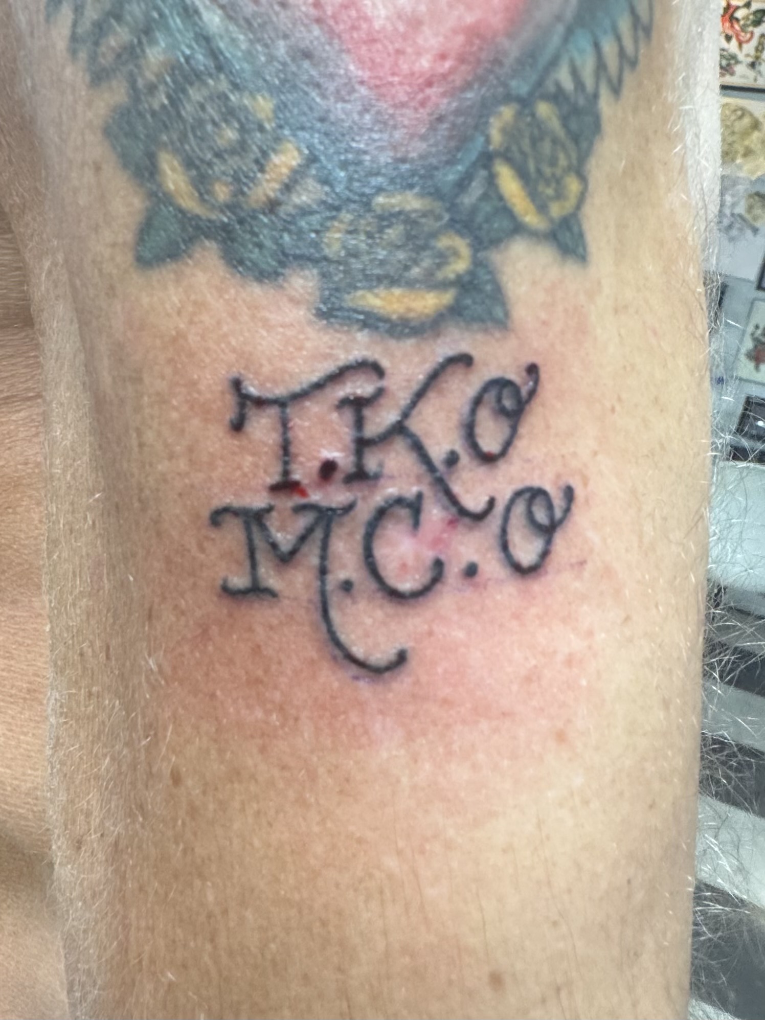 I have had this tattoo on my arm for years that represented my love for my Harley Davidson, my passion for life and the three yellow roses representing y wife and two daughter’s. It was only fitting to add the initials of my two grandsons.