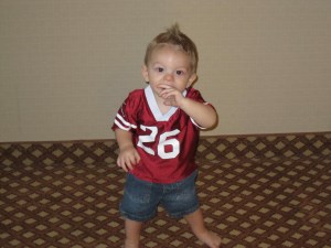 Talon standing in our hotel room in Avondale showing us how well he can stand on his own. He will take a few steps now and then but after that he’s on his hands and knees moving faster than I can move. I think Linda has taken me off the baby sitting duty because Talon is faster than I am.