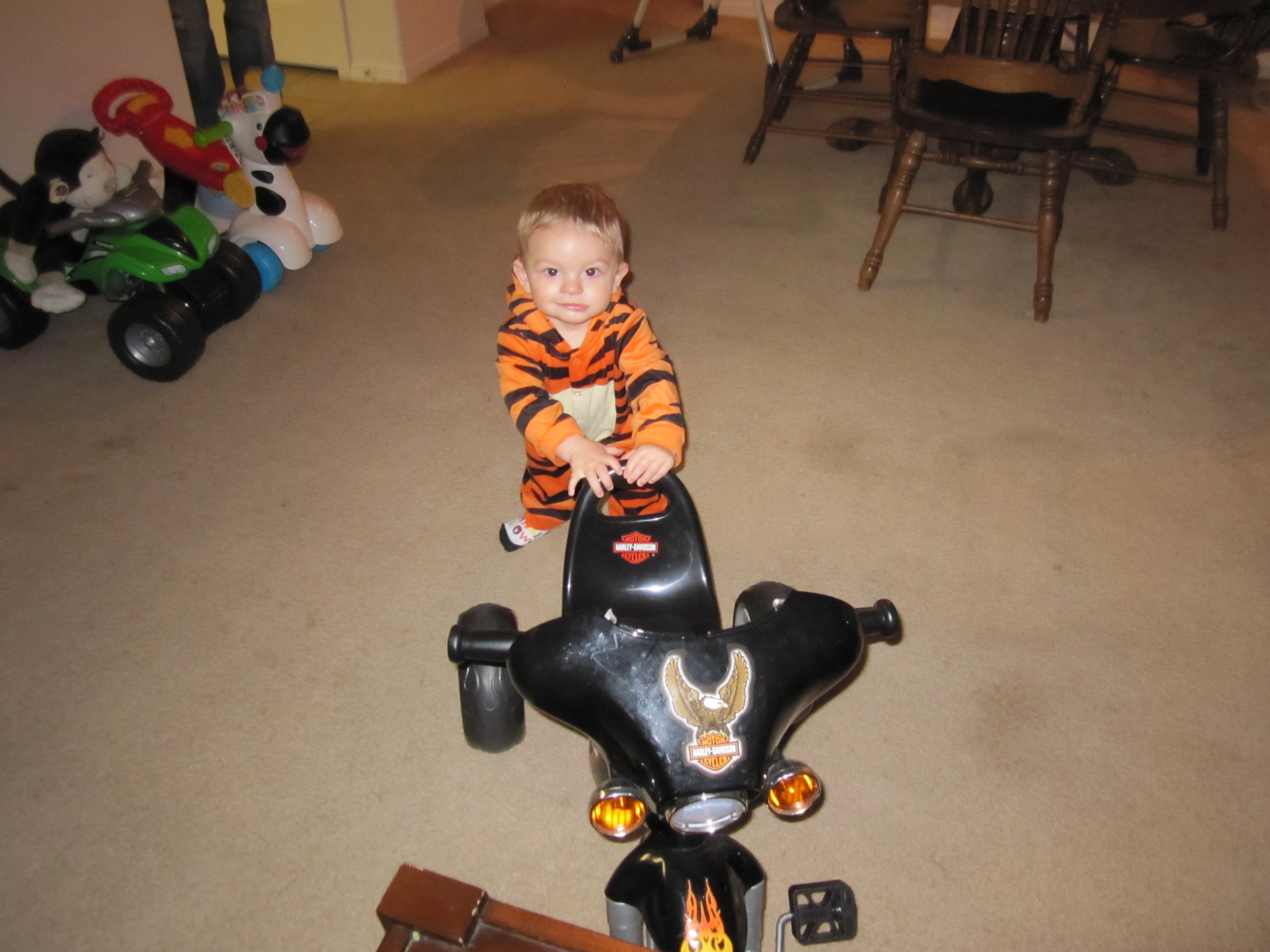 Talon just hanging out on his Harley. I think he needs a new one he is just getting to big and think he needs one with more speed!!! I can see a small 50 cc or 80 cc in his future.