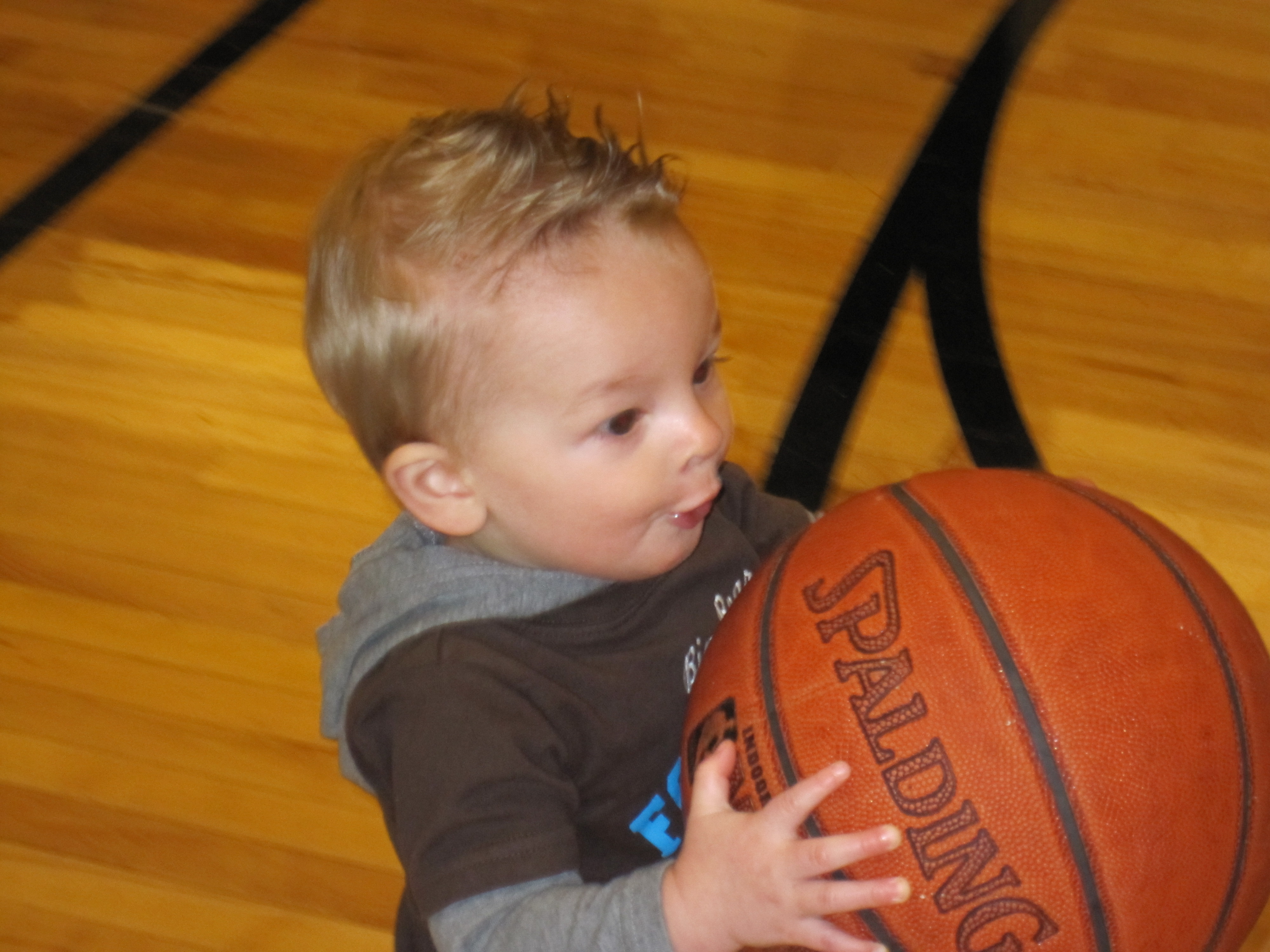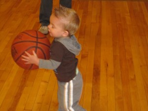 Talon is now walking pretty well in fact he walks so well he can carry a basketball that is just about as big as he is. Talon loves any kind of ball. We were at Linda’s family Christmas party and he had to play with the basketball all night.