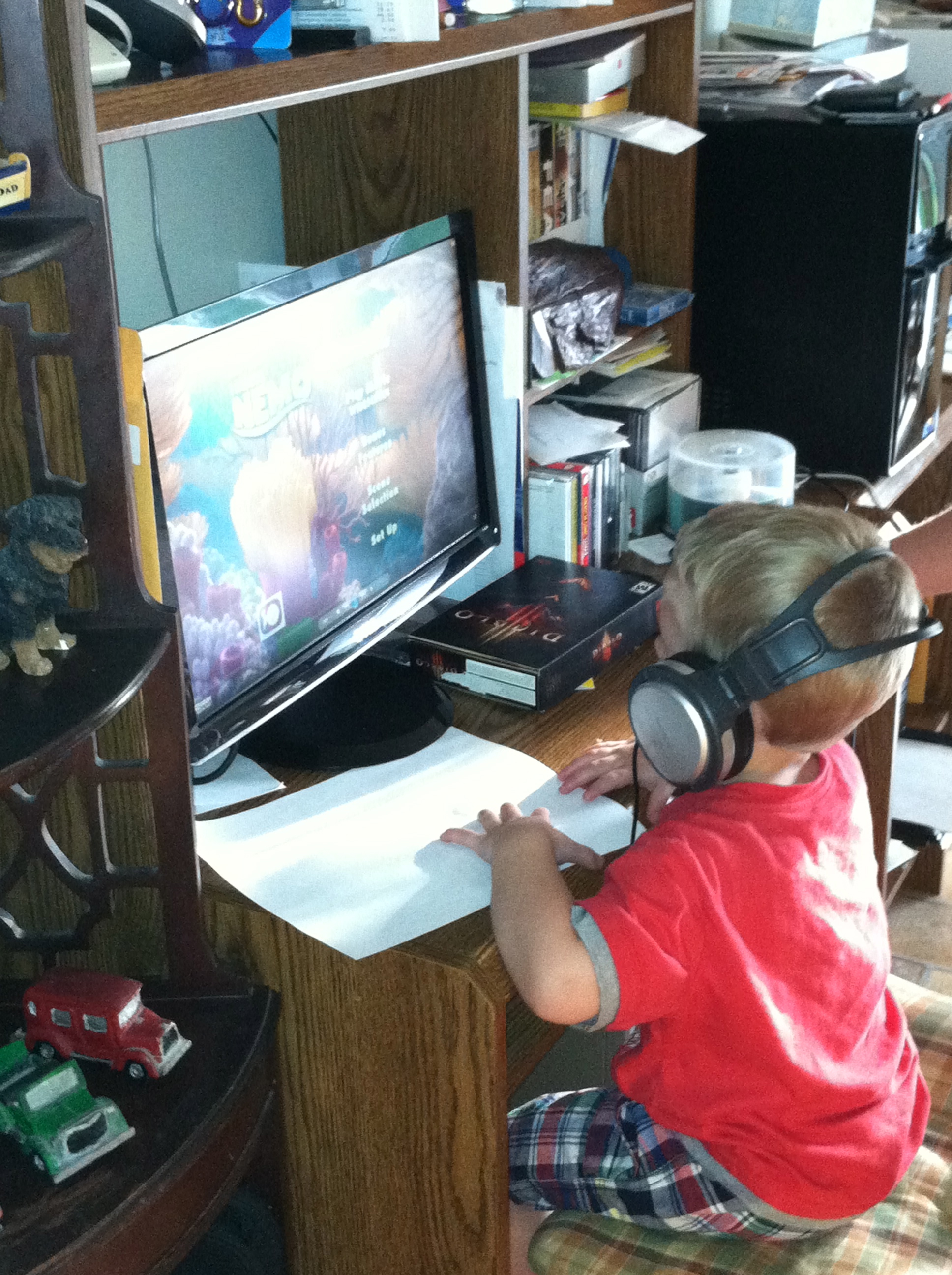 Benda has found a way to keep Talon busy and entertained… She just puts the headphones on Talon and loads a DVD into the computer. He sat there until he was ready to take a nap.