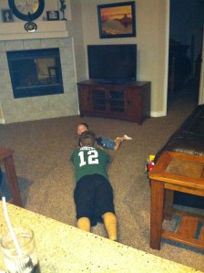 Talon and Jon wrestling on in the living room. Sometimes Jon wins and sometimes Talon wins either way it is fun to watch.
