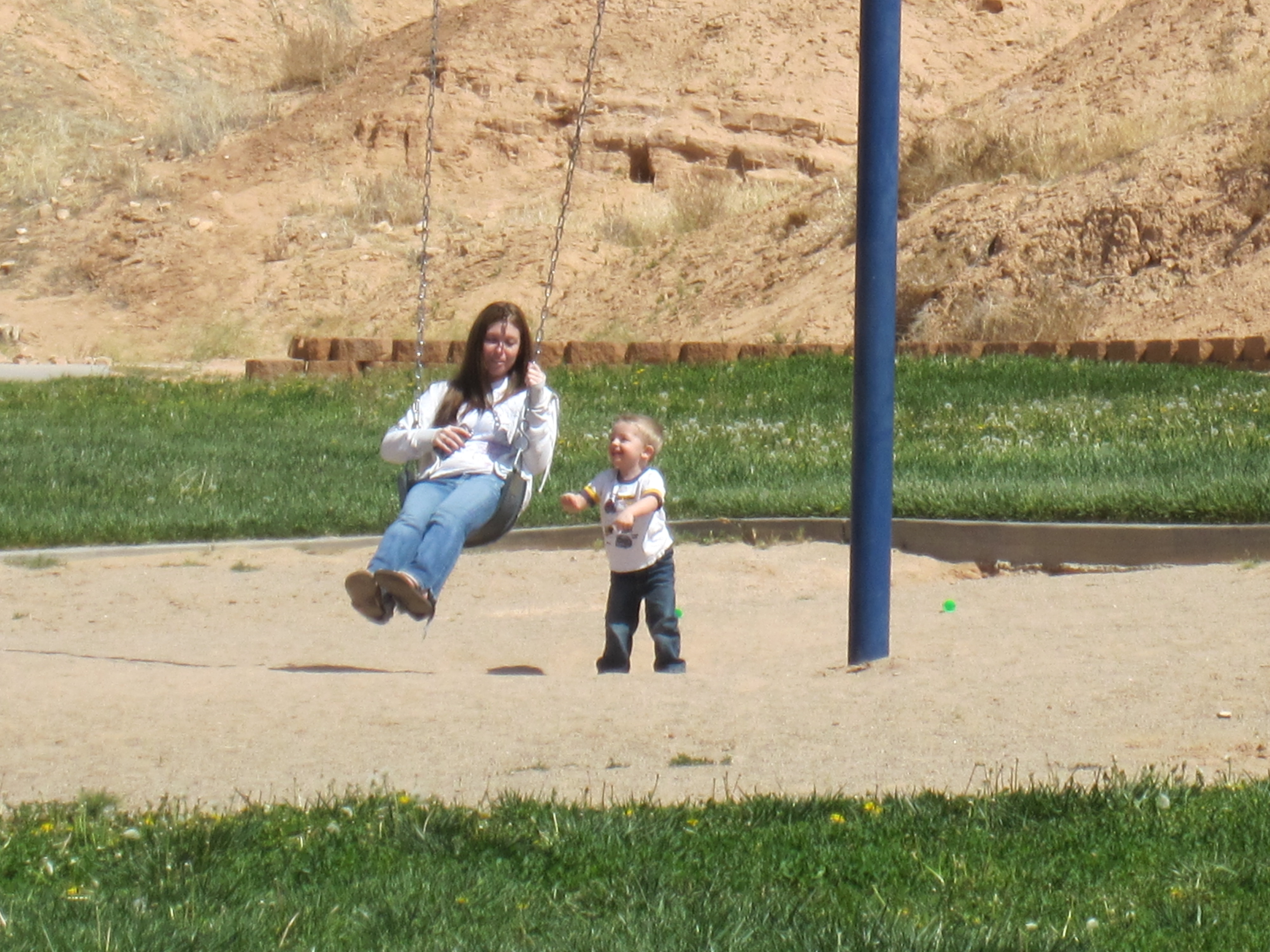 Here he is pushing him Mom on the swing. Good thing I took the picture when I did because when Tonianne came back it knocked Talon back about five feet.