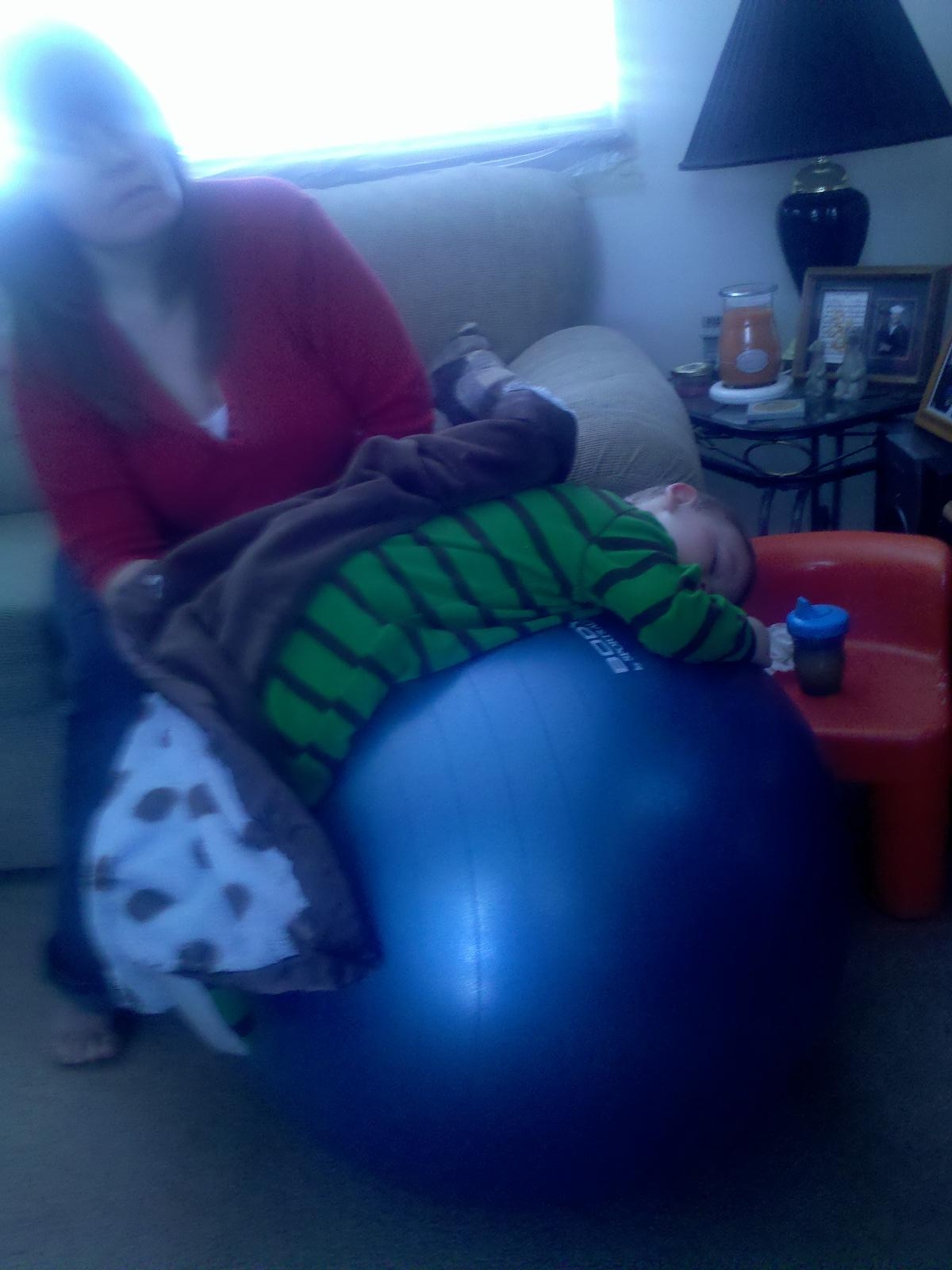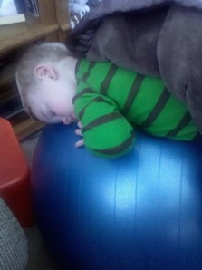 Brenda and Roger have been great helping Toninanne with Talon while she’s working, everyone knows how much Talon loves balls. These are great pictures of Talon playing on the ball and just fell a sleep on it so Brenda put his blanket on him.